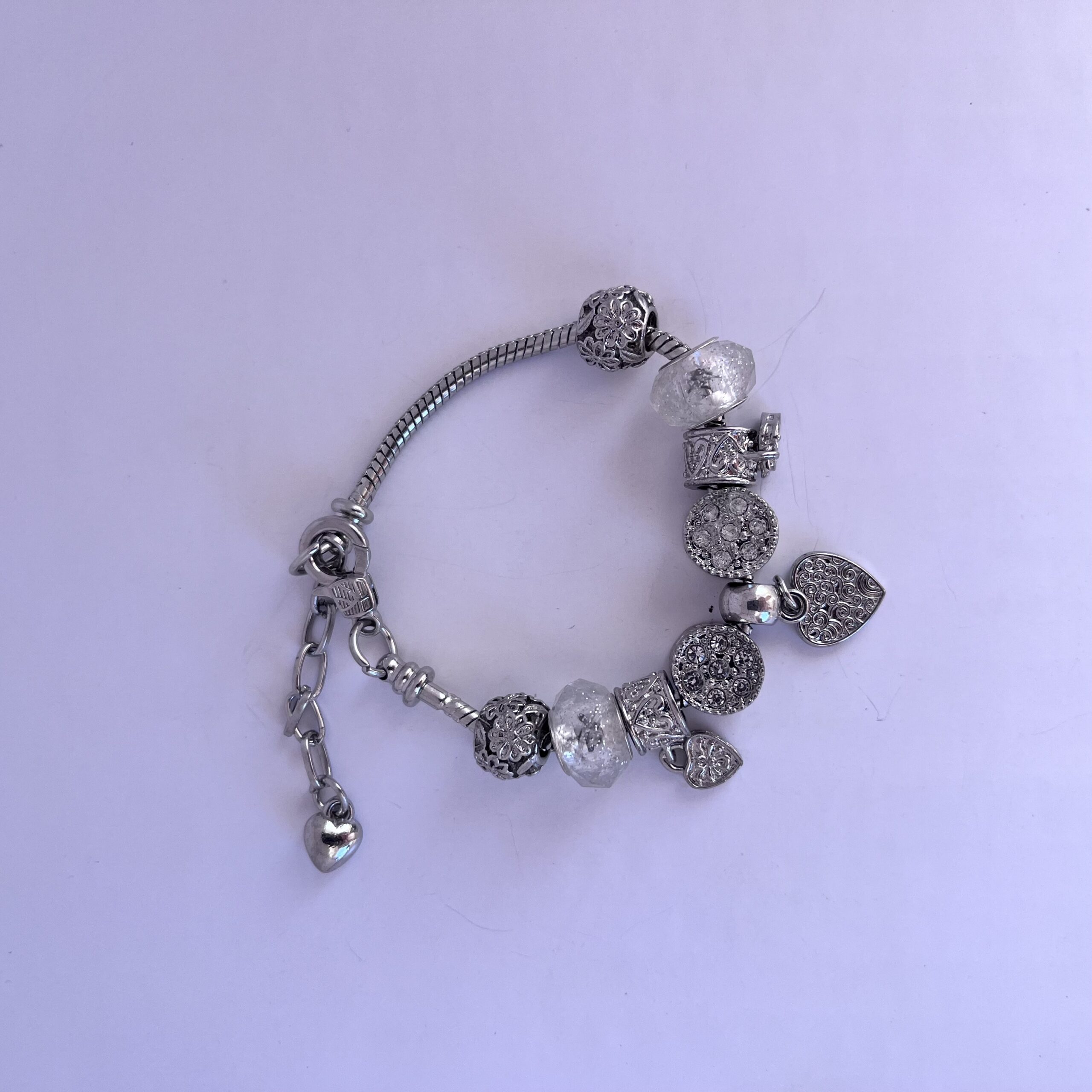 Pulsera Pandora ajustable a la mano (incluye cierre gancho langosta y cadena de ajuste), de acero inoxidable color plateada con diferentes charms de color plateados y transparentes.