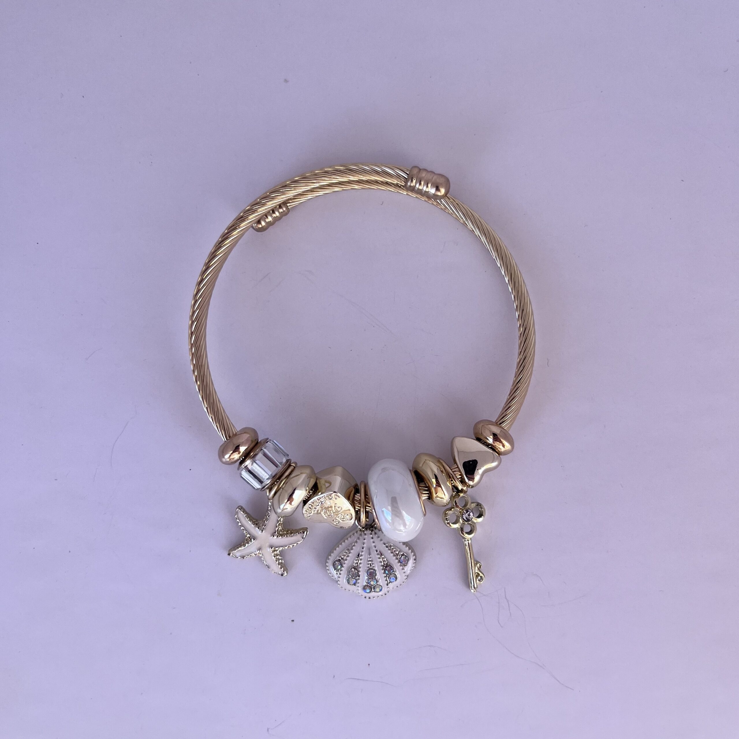 Brazalete de Pandora color dorado, ajustable y de acero inoxidable con charms de mar + llave color blanca