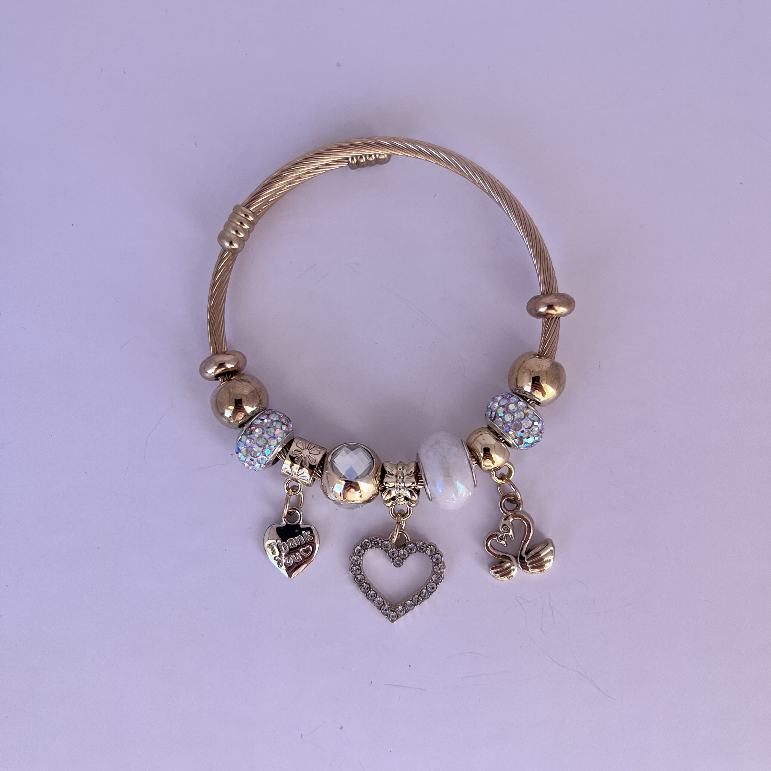 Brazalete de Pandora color dorado, ajustable y de acero inoxidable con charms de cisnes de color blancas con brillos