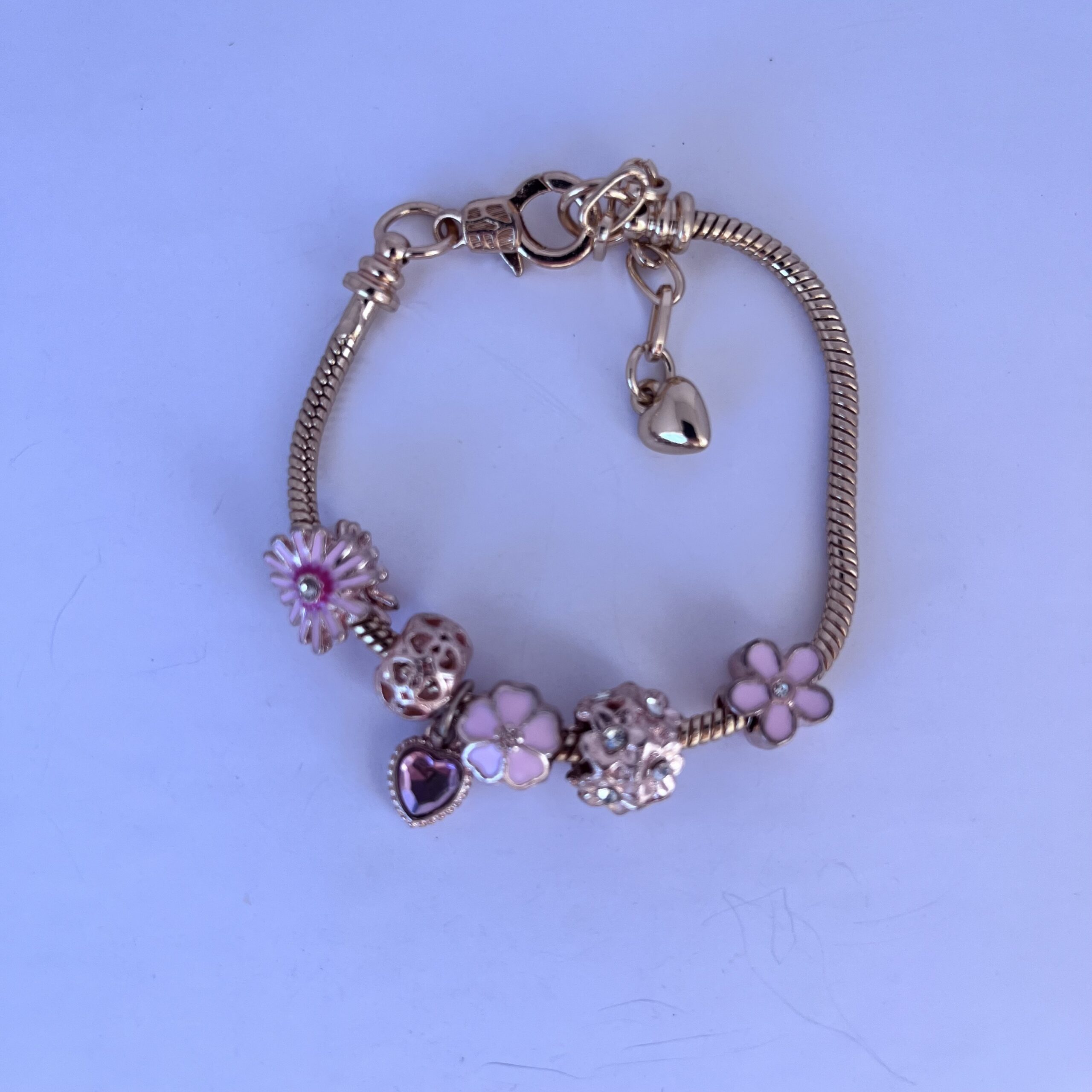 Pulsera Pandora ajustable a la mano (incluye cierre gancho langosta y cadena de ajuste), de acero inoxidable color dorado con diferentes charms de flores color dorados y rosas.