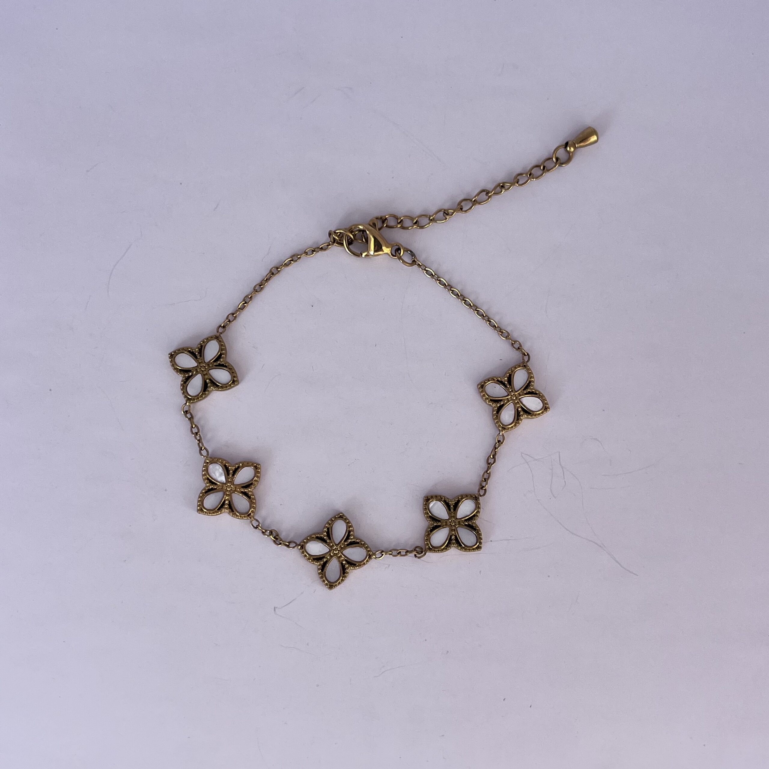 Pulsera ajustable a la mano (incluye cierre gancho langosta y cadena de ajuste), de acero inoxidable color dorada con diferentes dijes de flores de 4 pétalos blancas con dorado