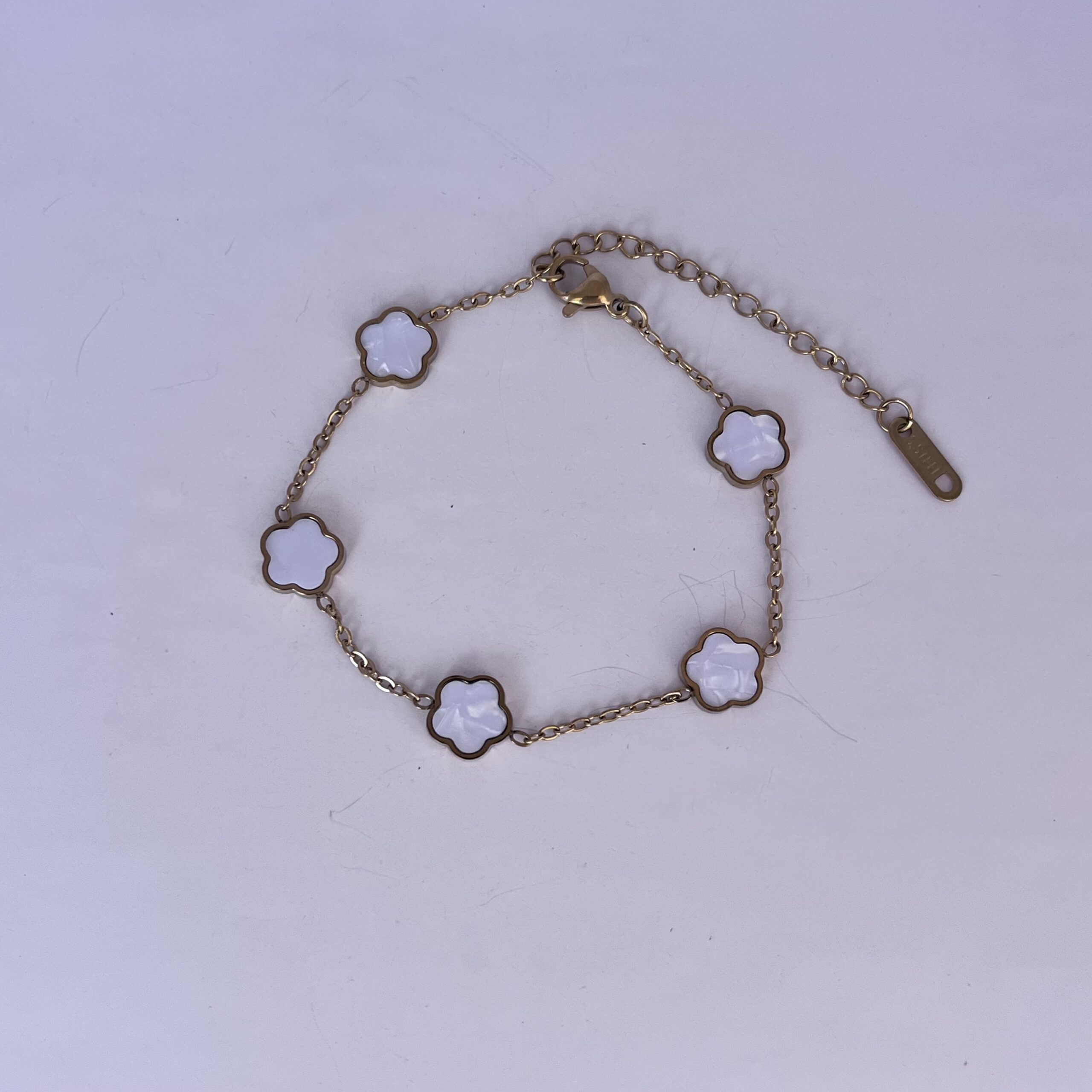 Pulsera ajustable a la mano (incluye cierre gancho langosta y cadena de ajuste), de acero inoxidable color dorada con dijes iguales de una flor llamada Plumeria.