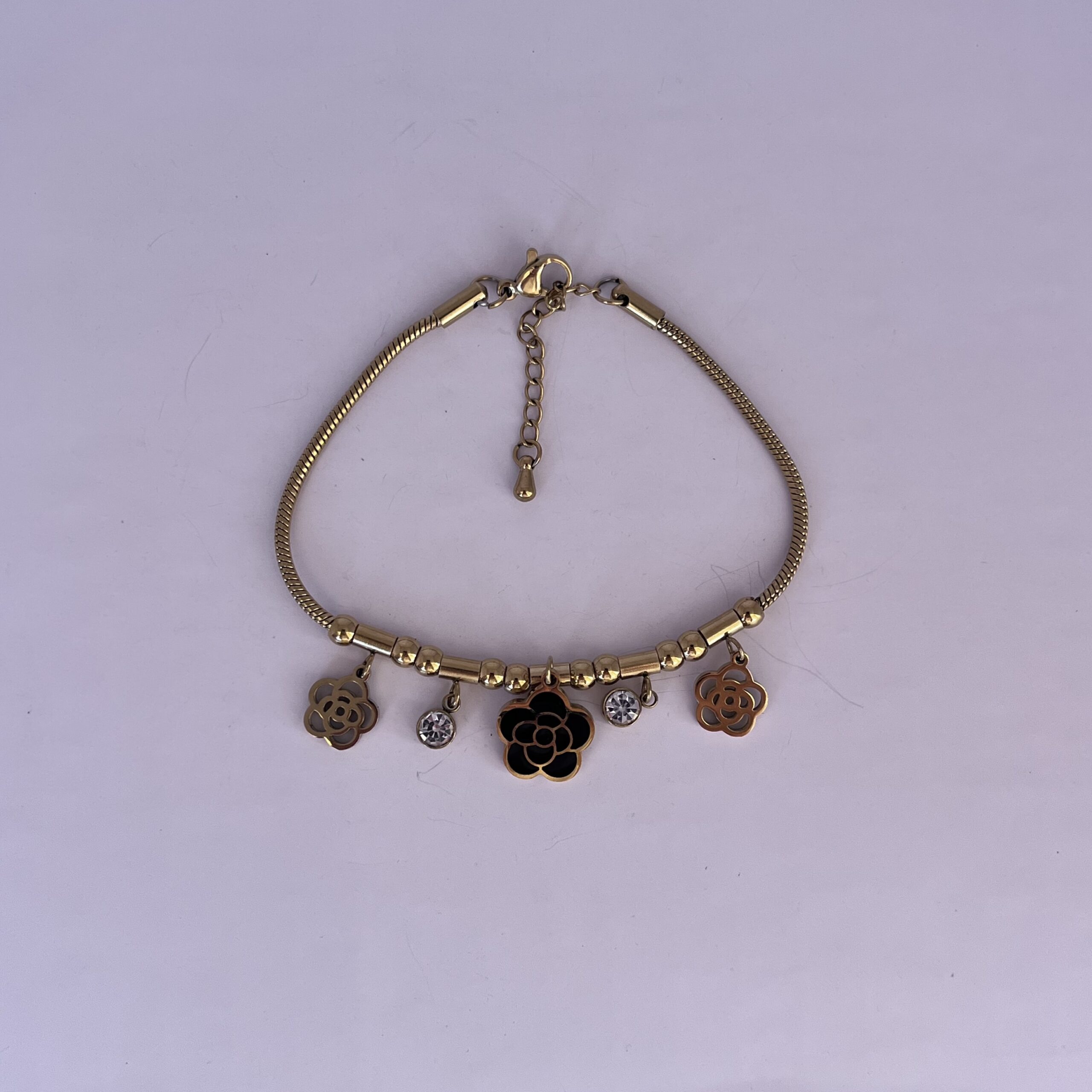 Pulsera ajustable a la mano (incluye cierre gancho langosta y cadena de ajuste), de acero inoxidable color dorada con diferentes dijes de flores simples, perlas transparentes y flor color negra.