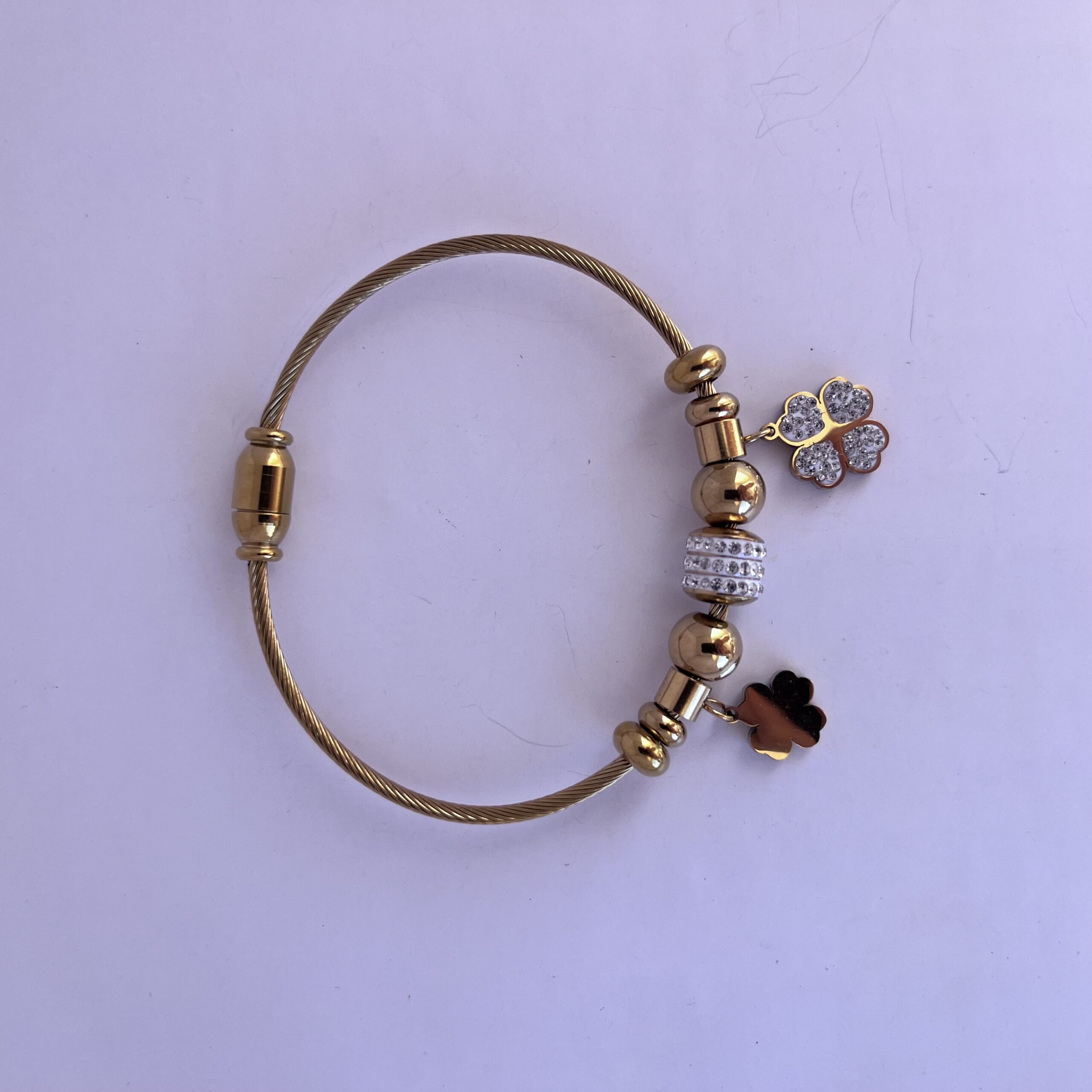 Pulsera de acero inoxidable con cierre de imán que contiene dijes de tréboles dorados y dijes con brillos.